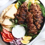 Serve with sliced tomatoes, red onions, lemon wedges and tzatziki sauce