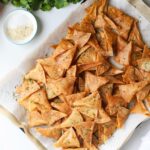 Once the chips are golden and crisp, use a large slotted spoon or spider to transfer them onto the paper towel lined baking sheet