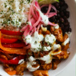 Assemble the bowls by adding cooked white rice, black beans, sautéd peppers, honey lime chicken and pickled onions into a bowl