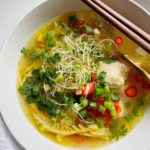 Ladle the soup into bowls and garnish with sprouts, thinly sliced chilies, green onions, cilantro and fresh lime juice to taste.