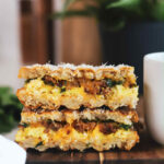 A crisp, buttery breakfast panini filled with caramelized Italian sausage, cheesy scrambled eggs and baby arugula.