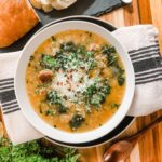 Add the browned meatballs, 1/2 cup of finely shredded parmesan and the thin sliced kale and stir to combine