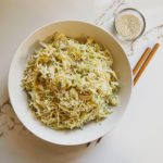 A simple side salad with super fine cabbage and a creamy, salty, tangy dressing that you will love.