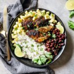Add a few scoops of creamy coconut rice into the base of a shallow bowl and top with jerk chicken, pineapple salsa and black beans
