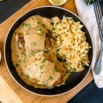 Once the skillet is hot, place the seasoned chicken thighs skin side down into the butter and olive oil and cook for 5-7 minutes