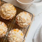 To glaze the muffins, whisk a cup of sifted confectioners sugar with a splash of vanilla extract and enough fresh lemon juice to create a consistency that will drizzle well.