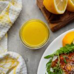 Combine 1/4 cup of freshly squeezed lemon juice, 1/4 cup of white wine vinegar, 1/3 cup of extra virgin olive oil, 1 large crushed garlic clove, 1 teaspoon of honey and a pinch of salt and black pepper in a jar or the vessel of a blender