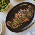 Slice the London broil thinly against the grain and top with the garlic pan sauce