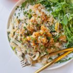 In a small bowl, combine 3/4 cup of panko breadcrumbs with 1/2 cup of grated parmesan and add 2 tablespoons of melted butter and evenly spread the mixture over the casserole and cover the dish with foil