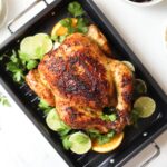 Transfer the chicken onto a roasting pan, brush with additional marinade and roast for 22-25 minutes per pound or until the chickens internal temperature reaches 165 degrees at the thickest part near the thigh (tent with foil if the chicken begins to brown too much before it is fully cooked)