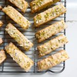 To garnish, whisk 1 cup of sifted confectioners sugar with about a tablespoon of freshly squeezed orange juice to form a drizzle-able consistency. Dip the tops of each cooled biscotti into the orange glaze and sprinkle with finely chopped pistachios and white chocolate. Return the garnished biscotti onto the cooling rack to allow the glaze some time to set