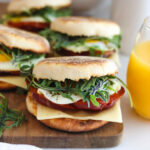 To assemble the sandwiches, place a slice or 2 of crispy pancetta over the havarti, add your cooked egg and season with a pinch of salt and black pepper, top with baby arugula and the top slice of english muffin