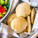 Once the pita is lightly golden and puffed, transfer it into a clean kitchen towel and repeat until all of the pitas have been baked