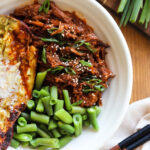 Stir 1/4 cup of tomato paste, 2 tablespoons of gochujang or sambal, 1/4 cup of brown sugar and 1/2 cup of ponzu into the vegetables