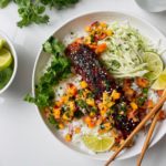 Assemble the bowls by layering rice, cabbage, salmon and salsa