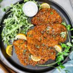 Transfer the egg coated chicken into the pretzel mixture and press to ensure that the chicken is well coated