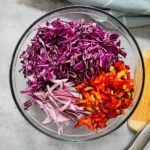 In a large bowl, combine the thinly sliced purple cabbage, red onion and rainbow chard stems