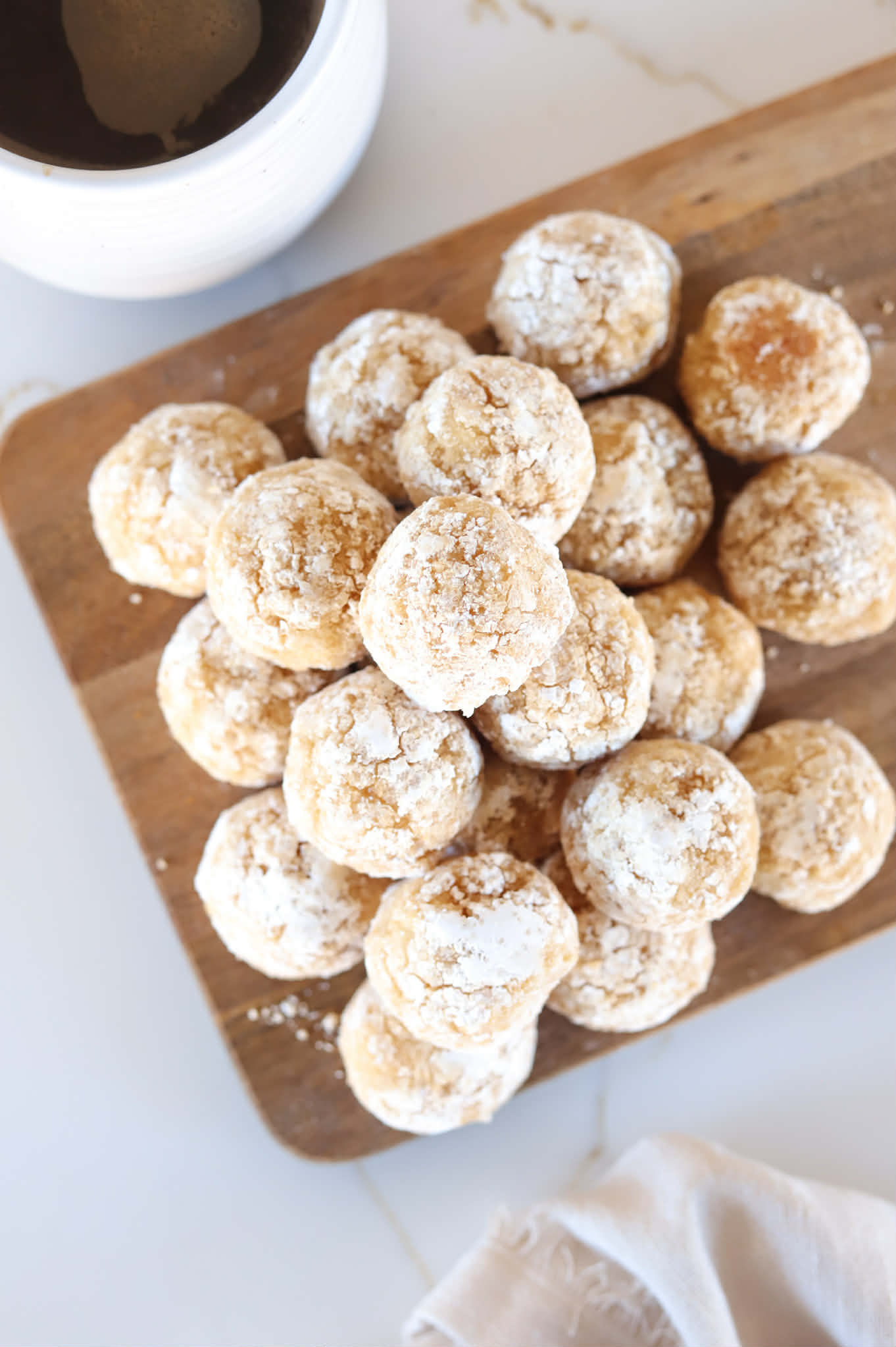 Roll a tablespoon of dough into a round ball and then roll in the course sugar and then the confectioners sugar