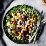 Top the arugula with roasted beets and garnish with crumbled goat cheese, finely chopped walnuts and pomegranate arils, if using
