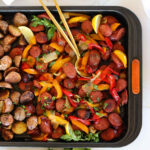 A simple flavorful sheet pan dinner with smoked sausage, sweet peppers, onions and potatoes. Perfect as a mid week meal or a weeks meal prep.