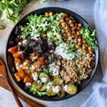 Roast the vegetables and chickpeas in a 400 degree oven for 25-30 minutes, tossing occasionally