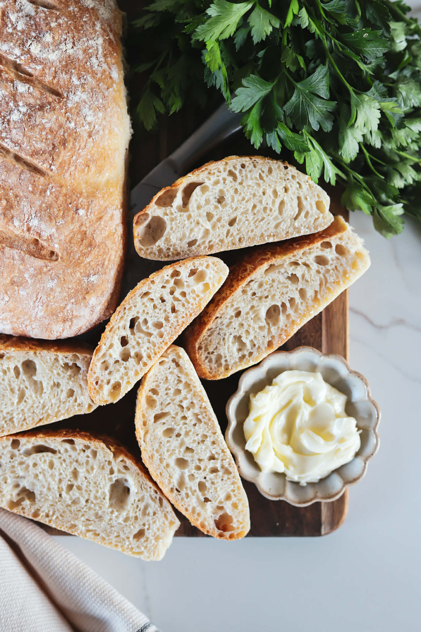 Simple rustic loaves that require no kneading and bake up with a thin crust, chewy texture and dense crumb. Perfect with soup, a roast or a big salad.