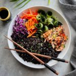 Flaky salmon served with fluffy rice, veggies, soy sauce and sesame seeds.