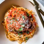 In a large bowl, combine 16 ounces of ground beef with 1/2 cup of panko breadcrumbs, 1/4 cup of milk, 1 egg, 3 cloves of finely minced garlic, 1/4 cup of finely chopped parsley, 1/4 cup of grated yellow onion, 1/2 cup of finely grated parmesan, 1/2 teaspoon of salt, 1/2 teaspoon of dried Italian herbs, a pinch of black pepper and a pinch of red pepper flakes