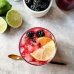 Make the blackberry simple syrup by combining 1 cup of fresh blackberries with 1 cup of granulated sugar and 1 cup of water in a small saucepan over medium height heat. Once the mixture is boiling, smash the berries and then remove the saucepan from the heat and let it sit for 10 minutes. Strain if you prefer a smooth consistency