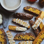 Using a serrated knife, cut both rectangles into 3/4” slices either straight through or diagonally (depending on how you want your biscotti to be shaped)