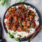 Serve with rice and garnish with sesame seeds, thin sliced green onions and pomegranate seeds