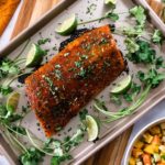 Remove the salmon from the oven and garnish with finely chopped cilantro and lime wedges