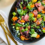 A flavorful, texture filled salad with lots of veggies, fresh herbs and tender marinaded steak all dressed in a salty, sweet and tangy Thai inspired dressing.