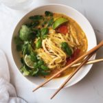 Shred the chicken and add it to the soup along with the sliced carrots, the juice from a large lime, coconut milk and the noodles