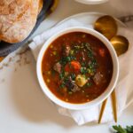 Add 15 ounces of fire roasted tomatoes and the remaining 5 cups of beef stock and bring the mixture up to a simmer