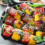 Fabulous summertime skewers with watermelon, sweet corn, poblano, red onions and an addictive glaze that grills up beautifully in just a few minutes.